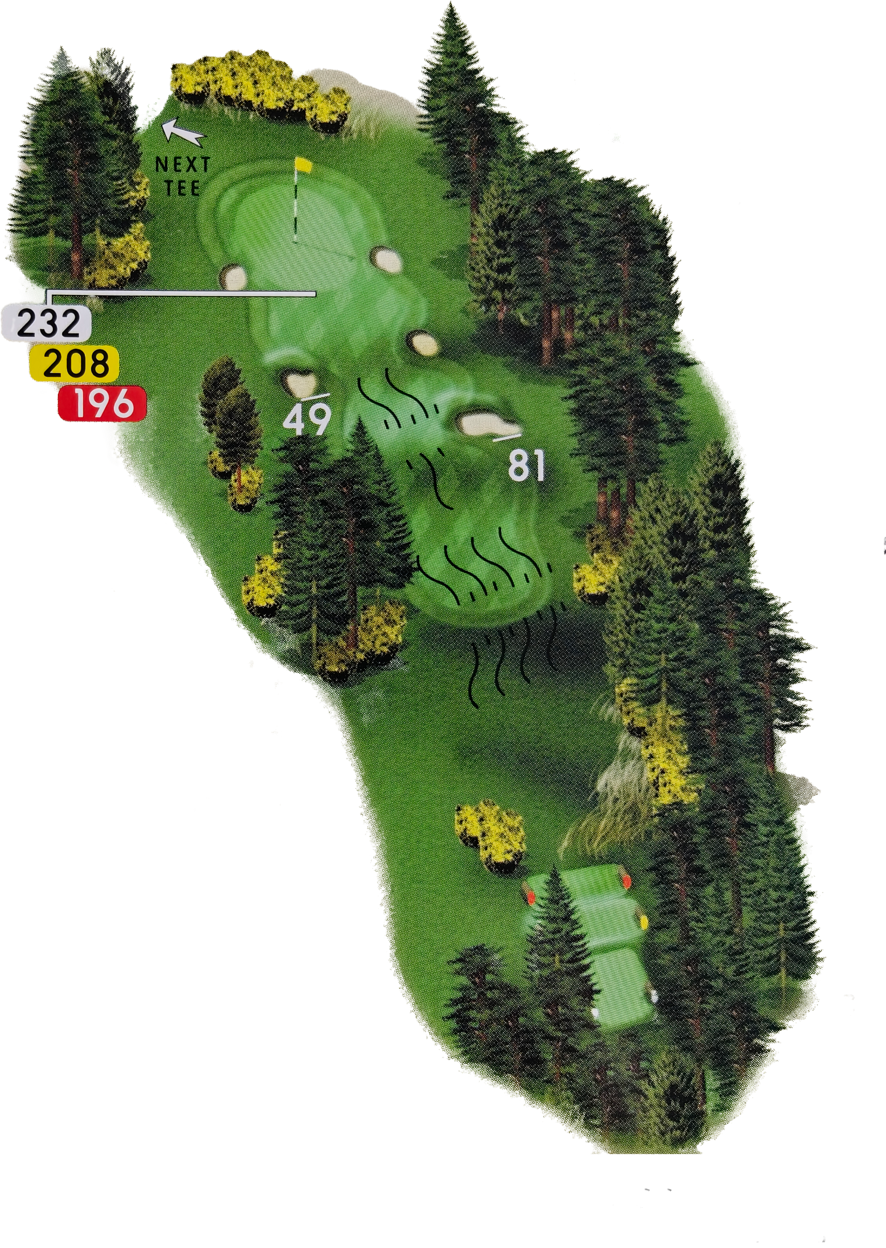 The longest and trickiest of the par 3s, from a raised tee to a fairway that slopes left to right and down from the last ridge, towards the green. Unless you are reaching the green with a high carry it can be difficult to hit and hold. Most players would happily take 3 here and walk on.