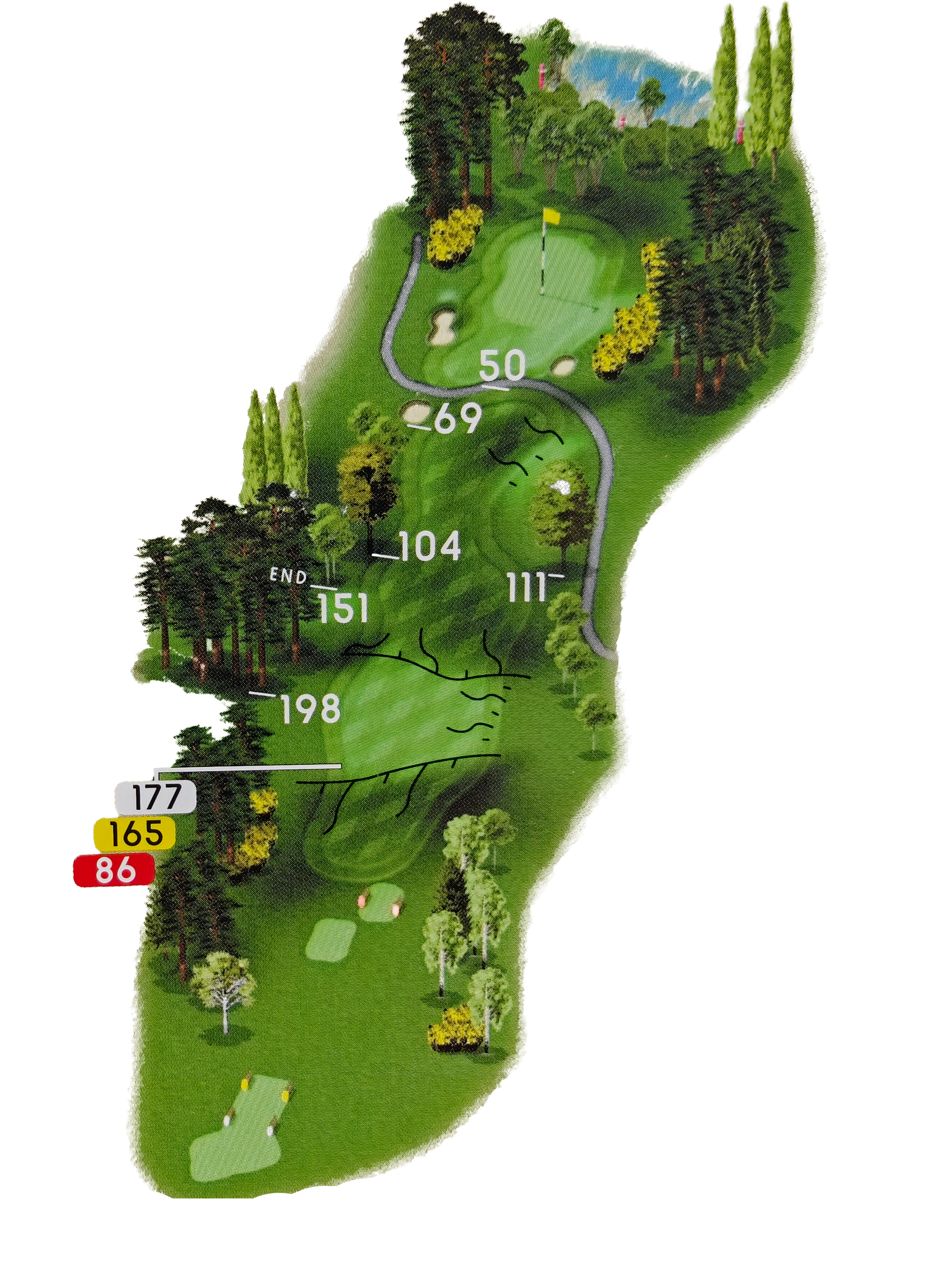 Danger lies at the back and to the right of the green with shrubs and trees all round. Go way too long and you will find that Pond again that features on 16.